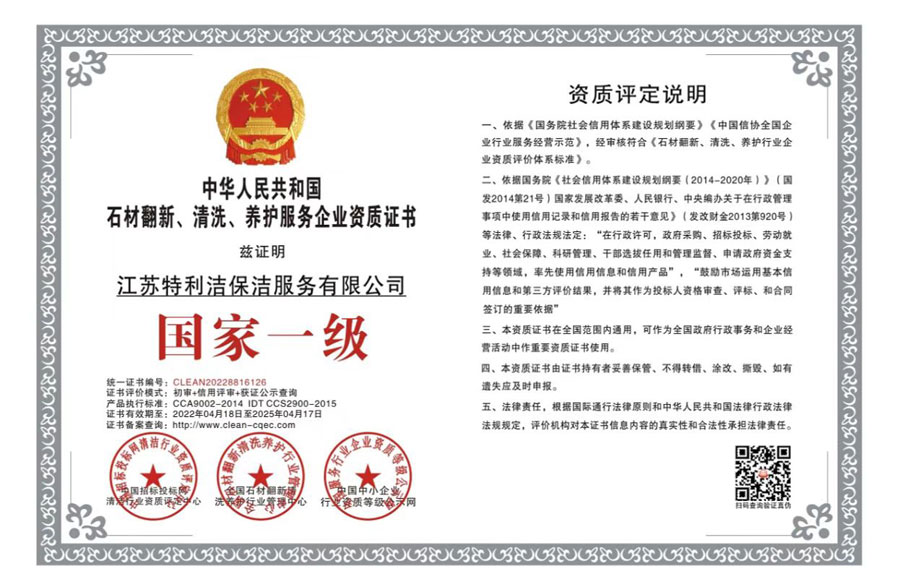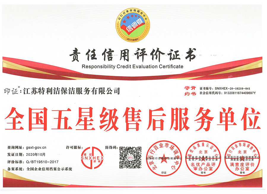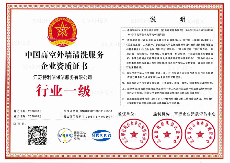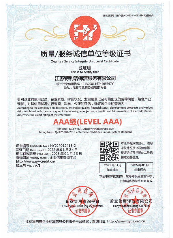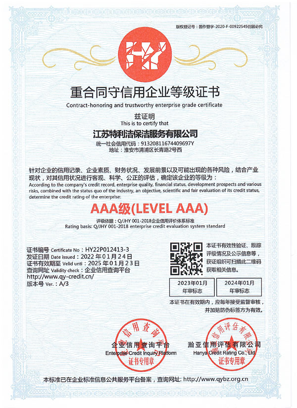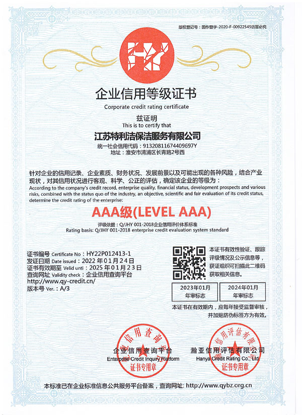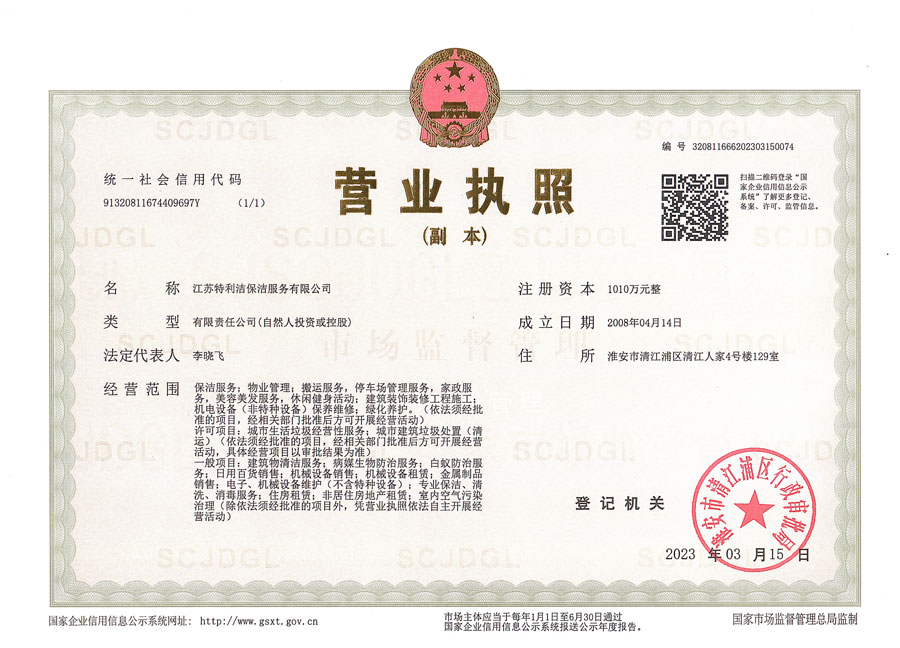 江蘇特利潔保潔服務有限公司(前稱為淮安市特利潔保潔服務有限公司),成立于2003年,于2018年經工商變更登記為“江蘇特利潔保潔服務有限公司”,是經工商部門登記注冊的合法企業。公司員工經系統培訓后上崗,本公司全部采用特利潔專業清洗設備、藥劑,并秉承了特利潔先進的管理模式,具備了專業的清洗技術、服務和網絡優勢以及一批訓練有素的專業清潔隊伍及管理人員,致力于推動淮安清洗行業朝著規范化、專業化、標準化方向發展。公司成立至今,經過我們全體員工的不懈努力,以及本著“誠信、專業、周到”的服務使得接受過我們服務的每一位客戶均能成為我們的長期合作對象。公司也從起初十幾名員工的小公司逐漸發展壯大,現已初具規模,并在保潔行業當中占據一定份額,F與恒大集團等世界500強企業建立戰略合作。2018年10月公司取得三A信用評級、三A重合同守信用單位...